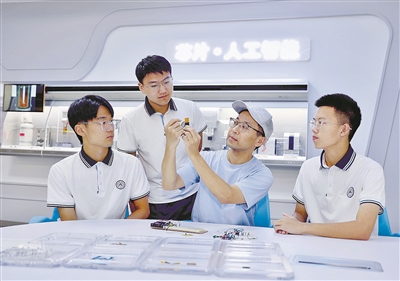 昨日,在温州市第八高级中学芯片实验室里,专业老师指导学生制作芯片。