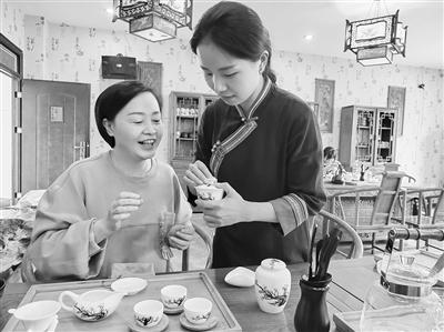 | 毛健丽(图右)正在向职工讲述惠明茶的泡法。 |