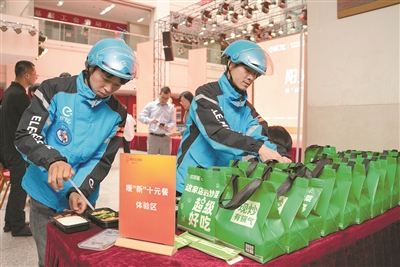 | 图为饿了么小哥现场体验十元美食套餐。 通讯员林金坚 摄 |
