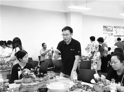 | 花艺大师应国宏(前中)向学员们讲解插花技巧。 |