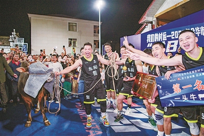 当晚,金华市首届“村BA”男子篮球赛颁奖仪式很特别,“农”味十足,冠军队的奖品是一头黄牛,第二名至第四名分获一头两头乌、一只羊、两只鹅。