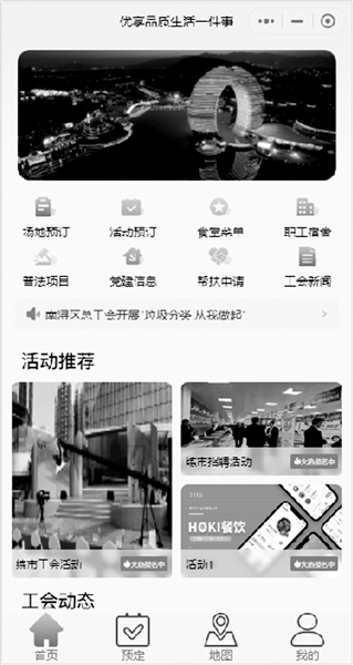 在微信小程序搜索“优享品质生活一件事”,会得到一个可以随时查看宿舍情况、了解食堂菜品、预约活动场地、申请困难帮扶等几乎涵盖南浔职工各方面需求的掌上办事小程序。里面罗列着党建信息、场地预订、活动预订、食堂菜单、职工宿舍、普法项目、帮扶申请、工会新闻共8个模块,它们分别属于优享阵地场景、优享活动场景和优享帮扶场景。