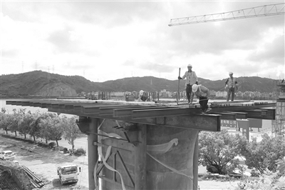 昨日,杭绍台高铁线温岭至玉环铁路漩门湾大桥工程工地上,中铁十四局工人在不同的岗位上,浇筑桥墩、安装现浇梁模板,为海岛早圆高铁梦而有序推进工程建设。