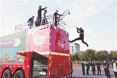| 一位市民正在消防宣传车上体验缓降逃生。 |