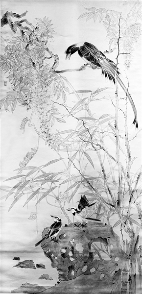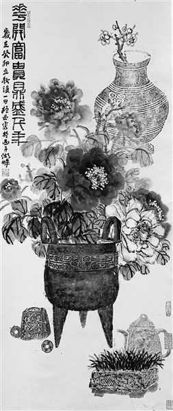 这幅画的作者阮振亚系浙江现代画院副院长、杭州市老年书画家协会副主席,他介绍说:“作品是采用了传统的全形拓技法并作了适当改良,吸收了版画的技法,合二而一。这种画的形式是花鸟画中的一脉,叫博古画,或叫清供画,流行于清代至民国。现在画博古画的人有,但是采用全形拓技法的少见。希望通过这次展览,让更多人了解全形拓技法。”