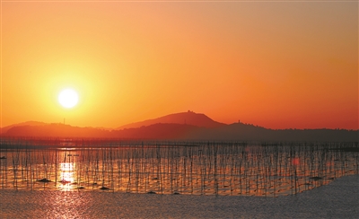 昨日清晨,玉环市干江镇“海上菜园”上,一排排整齐排列的紫菜和游弋的小船,与绚丽多彩的霞光交相辉映,构成一幅美丽的丰收画卷。通讯员吴达夫 摄