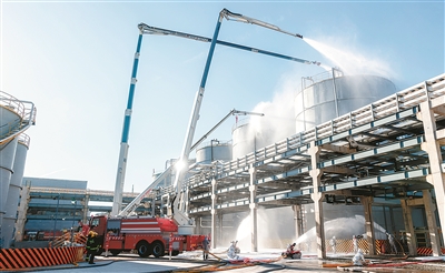 演练模拟位于衢州智造新城的时代锂电厂区内突发储罐火灾事故,参演力量结合“空地一体化”等战术特点,紧张、规范、有序地展开灭火作战,进一步提升专业化队伍实战、合作能力,增强灭火救援和特种灾害事故处置能力。通讯员傅元璋 记者邹伟锋 摄