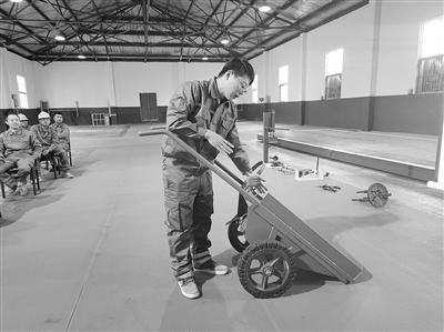 图为参赛人员介绍便捷多功能氧气瓶手推车的制作过程。针对生产现场检维修的特点,该职工通过研发创新自制底部带铰链可翻立的移动小车,并设置工具包、灭火器储槽、气瓶卡扣等安全措施,检修时能一次性将检修工器具带齐全,气瓶装卸也安全受控,降低物体打击的安全风险,提升检修效率。