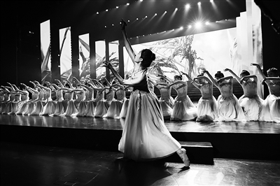 温州大学舞蹈团表演的古典舞《绣梦情长一线间》,只见身着一袭青衣的表演者们伴随着飞扬轻盈的裙角、优雅灵动的舞步,舞出对新时代美好生活的憧憬,令人眼前一亮。