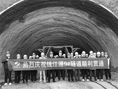 钱江源九号隧道为项目首座贯通隧道,全长329米,以泥岩为主,整体埋深较浅,洞口段为V级围岩,地质复杂,广大工程建设者克服重重困难,历时4月顺利贯通。