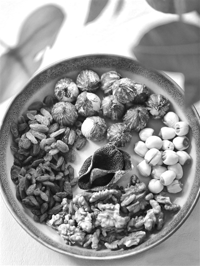 原料:生栗子6个、生核桃6个、莲子6个、桂圆6个、枸杞15克、大枣15克、葡萄干10克、陈皮10克。