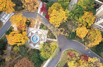 这段时间,漫步在杭城街头,你能看到枫叶红杏叶黄,美丽城市色彩斑斓,正是一年之中最美的时光。图为俯瞰杭州市余杭区桃源小镇小区美景。