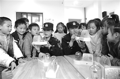 图为民警、辅警向小朋友们介绍毒品的种类。
