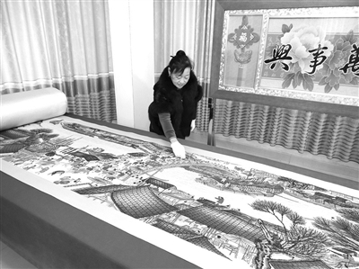 其实,在这幅张择端版《清明上河图》刺绣作品完工前,他们绣出过长45米的清院本《清明上河图》、25米的《百骏图》(清)、20米的《浴马图》(元)、18米的《五牛图》(唐)、12米的《韩熙载夜宴图》(五代)等作品。