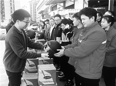 | “娘家人”为快递小哥送上加绒头盔。 |