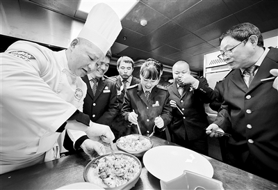 屠杭平及其团队成员对列车上计划推出的4款“越美味”套餐盒饭,即大排、卤肉、手枪鸡腿、狮子头盒饭进行业务培训,从原料的采购、烹饪的细节、列车线路特点、营养搭配、旅客口味进行现场烹饪教学。杭州之江饭店厨师长胡云丰带领大家制作煲仔饭。他说,要烧好一碗煲仔饭,第一,米要好,淘米水的温度要控制在30摄氏度左右,米饭在七成熟开始冒泡时加主菜,同时要注意把控火候。煲仔饭的食材,可以选择腊肉、腊肠、鸭肉。现场学习氛围浓郁,大家品尝菜品之后,对列车上即将推出的新菜品更有信心了。