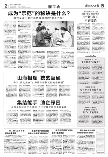 本报讯 记者金钧胤报道 山海相逢,技艺互通。近日,海宁市总工会和武义县总工会在海宁技师学院尖山校区联合成立“山海协作劳模工匠助企联盟”。