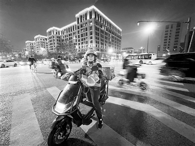| 正在杭州西溪银泰城附近跑单的黄晓琴。 记者寿慧桢 摄 |