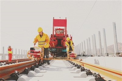 杭温铁路二期铺轨现场施工人员用螺丝机安装扣件画面。