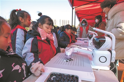 昨日,金华市金华开发区秋滨小学科技节专场活动中,学生在体验“对弈机器人”项目。