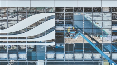 近日,杭温高速铁路台州市仙居站项目施工现场,工人们正在进行站房幕墙安装施工,确保工程如期完工。