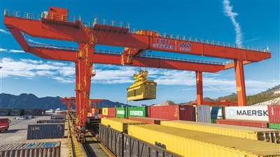 2023年12月31日,浙江交通集团永康东站内,一列海铁集装箱班列正在装车,准备运往宁波舟山港。