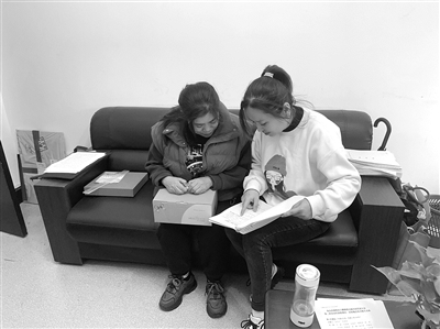 | 陈卡露(图右)为职工介绍困难职工帮扶政策。 |