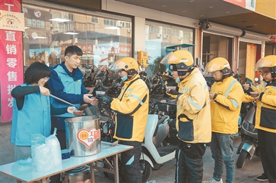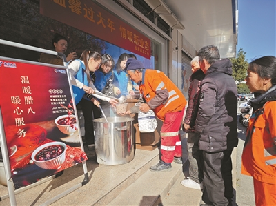 ▲1月18日,在台州市路桥区金清镇,镇总工会工作人员为户外劳动者送上一碗碗温暖的腊八粥。当天,金清镇总工会结合“两节”送温暖活动,组织开展了“喜迎腊八 ‘驿’起暖‘新’活动”,给留台过年的外卖小哥、环卫工人等户外劳动者送上腊八粥、春联、福字和年货礼包,让他们感受来自工会的关怀。