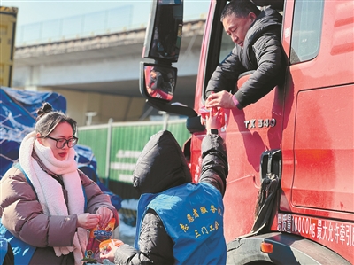 昨日,受雨雪天气影响,甬台温高速公路连接线三门岭口互通关闭,导致数百辆货车滞留在收费站口。三门县总工会第一时间组织工会志愿者赶到岭口高速路口为滞留货车司机、旅客送去八宝粥、自热米饭、方便面、水等物资,让他们感受工会组织的温暖关怀。