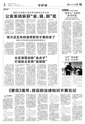 “沉下身子”扎根基层,“挑起担子”彰显责任。近年来,郑祥彬还化解各类矛盾纠纷210余起,帮助困难群众20余人,多次收到群众锦旗,并曾获三能榜样·最美浙警、全市公安机关服务保障三个“一号工程”十佳民警、个人三等功1次、个人嘉奖3次、多次获得“优秀共产党员”“优秀公务员”等荣誉称号,让为民服务的星光一直闪耀这片“星海”。