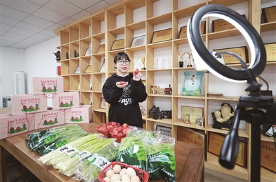 ②在杭州良渚麟海蔬果专业合作社共富直播室,主播夏诗妤正在为当季草莓、蔬菜等农产品直播带货中。