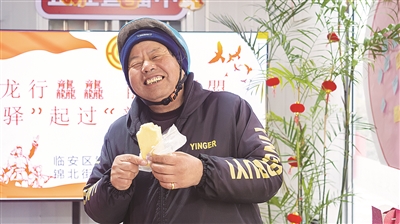 | 一位骑手在“爱心驿家”开心过大年。 通讯员刘平 摄 |