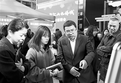 | 企业招聘专员向求职者介绍岗位情况。 |