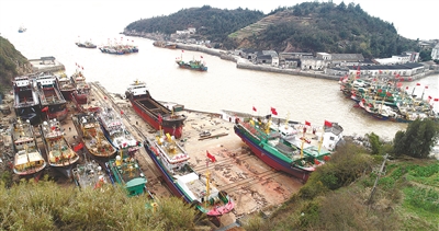 近日,在玉环市灯塔船舶修造厂,工人们正在检修船只,以最快的速度使之投入春汛渔业捕捞生产和航运生产。