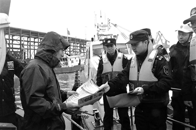 日前,台州市公安局椒江分局港区派出所会同当地农水局、海事局、行政执法局等部门开展联合巡航执法行动,向渔民讲解禁渔期与海上安全等知识,并提醒渔民必须严格遵守相关法律规定,严禁从事禁渔期捕捞等活动。通讯员何文斌 摄
