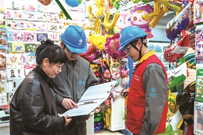 | 2月21日,义乌国际商贸城开市啦!为全力保障义乌市场开市、企业复工安全用电,国网义乌市供电公司主动上门服务,对商户进行安全用电宣传。陈姣姣 摄 |