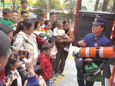 消防员向孩子们详细介绍了消防车上的消防装备,并讲解了相关消防安全知识。