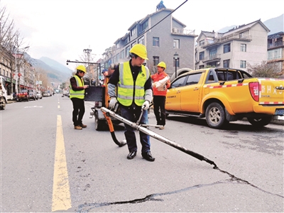 近日,开化县墩月线K0+050路段,开化县公路港航与运输管理中心的养护人员正忙着对路面进行灌缝保养,当天共灌缝2396米,32平方米。作业进一步提升了路况路貌,优化了行车环境,确保山区公路路面平整、安全畅通,助力全国文明城市创建。