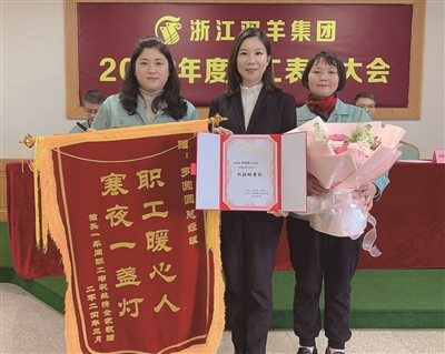 | 浙江双羊集团职工代表为总经理罗圆圆(中)颁发“阿拉好老板”奖。 通讯员周淑 摄 |