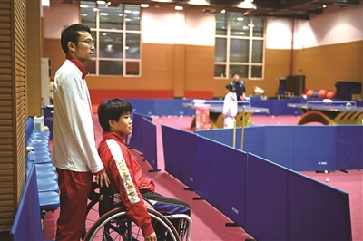 | 吴登相(图左)为残疾人运动员提供服务。 |