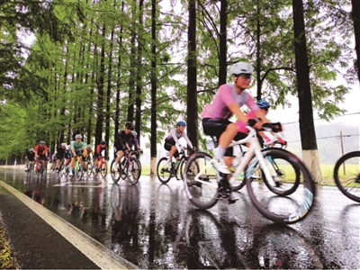 此次骑行途经的开化最美公路——桃下线,起点位于桃溪村,终点位于下界首村,沿线经过10多个村庄,道路全长20多公里,是开化县城通往多个乡镇的交通要道。图为骑手们正穿越桃下线星口路段,放眼望去,公路两旁水杉满目翠绿,高耸入云,美不胜收。 徐曙光、余坚 摄
