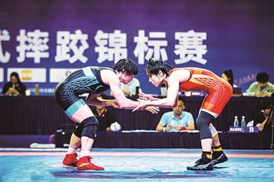 近日,在温州奥体中心体育馆举行的2024年全国国际式摔跤锦标赛比赛现场,运动员在进行比赛。