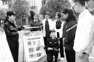 近日,东阳市公安局南市派出所民警来到辖区学校,开展以“珍爱生命 远离毒品”为主题的禁毒教育宣传活动,进一步提高学生们的禁毒意识,护航最美花季、共建无毒校园。图为民警向学生宣讲毒品的种类和危害。