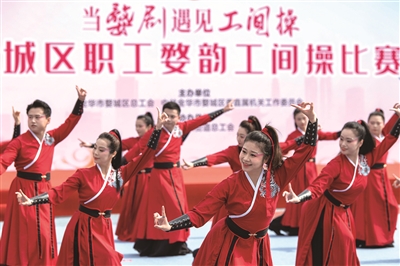 婺剧作为国家级非物质文化遗产,是金华市传统文化最具代表性的艺术瑰宝。今年开始,婺城区总工会制订了“婺韵工间操”培训计划,让工间操跳进车间、社区、学校,弘扬中华传统文化,推动婺剧传承发展。此次“婺韵工间操”比赛,共有来自基层工会的23支队伍、640余名职工参加。通讯员胡肖飞 摄