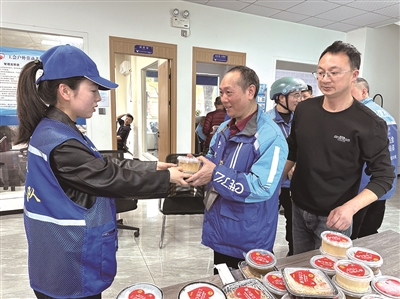 | 浦江县总工会在驿站组织爱心餐公益活动,为外卖小哥送上暖心食物。通讯员金瑛 摄 |