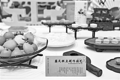 在展示现场,婺式传统糕点制作技艺展台上摆满了小巧精致的糕点,这些糕点被做成了“两头乌”、金华佛手等形状,样子栩栩如生,可爱极了。展台旁,婺式传统糕点制作技艺金东区级代表性传承人楼洪亮现场制作糕点,供人免费品尝。