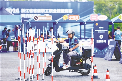 竞赛依照《网约配送员国家职业技能标准》三级(高级工)标准,结合理论测试与实操演练,全面评估参赛者的专业水平。“S弯绕行”“过独木桥”“绕杆骑行”……除了对车技、配送稳定性、取餐验餐等进行考验,竞赛还通过“情景演练”,对选手的话术标准、解决方法、表达能力等维度进行打分。最终,来自饿了么的朱明李一举夺冠。前三名选手除了赢取相应的奖金外,经浙江省总工会核准后可被授予“浙江金蓝领”称号。