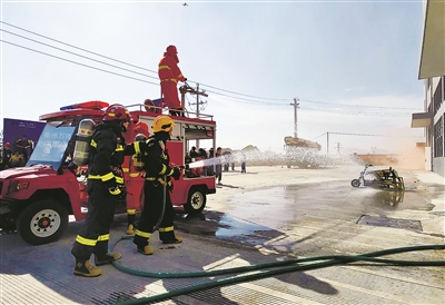 图为消防员与微型消防站队员协同作战扑灭“火灾”。