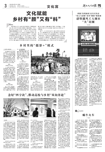 繁荣发展乡村文化,推动农耕文明和现代文明要素有机结合,把乡村变为艺术空间,将田野化为画布和舞台,“艺术乡建”让传统文化与现代艺术在乡村交融,让广袤的乡村实现物质富裕和精神富有齐头并进……2023年以来,我省各级文联和广大文艺工作者将“艺术乡建”作为全面推进乡村振兴、助力共同富裕的重要抓手,结合各地实际进行了一系列大胆探索和有益尝试,或以艺术融入乡村,或以艺术助力乡村美好生活,或以艺术帮助村民开展创作——用艺术再造乡土,取得了积极成效,涌现了不少值得借鉴推广的好经验好做法,稳步推进“艺术乡建”全国先行示范,将更多点缀在之江大地上的“盆景”转化为推动乡村精彩蝶变的“风景”,逐步构建出一个充满创意与活力的乡村文化生态圈,为新时代的乡村振兴注入了无限可能。