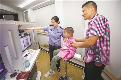 暑假来临,随着办理身份证、出入境证件的学生和家长增多,公安机关的办证窗口也迎来了人流高峰。图为昨日,台州市公安局黄岩分局办证中心里,一位民警正在指导小朋友拍出满意的证件照片。连日来,该分局办证中心和出入境管理大队窗口通过科学调配警力、增加动态受理窗口,为学生和家长提供贴心服务。